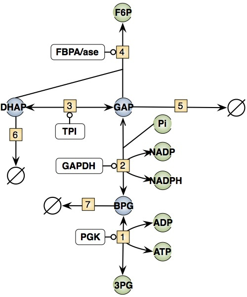 The PGK, GAPDH, TPI and FBPAase were modelled together using the individual rate equations. Closed system.